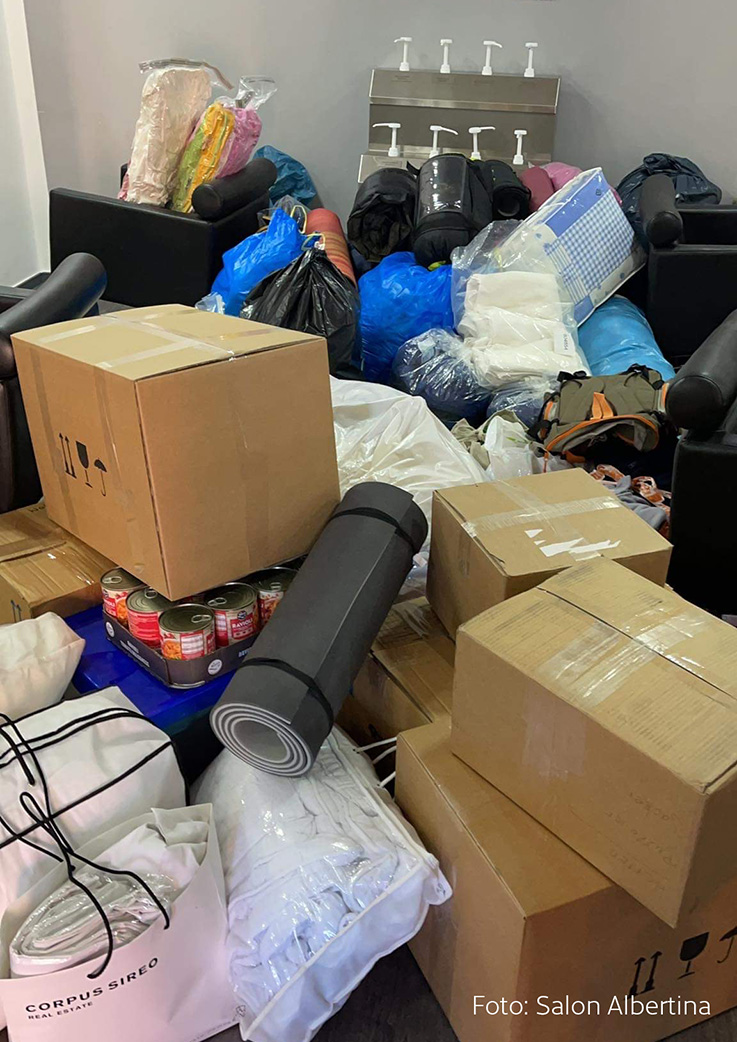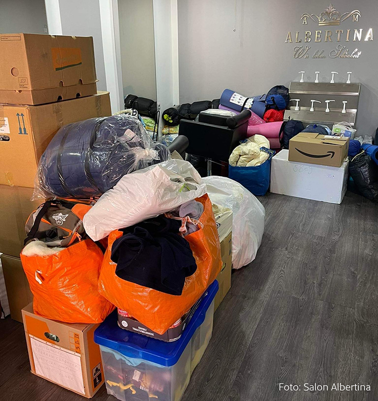 stapelten sich Kisten und Tüten voller Hilfsgüter. Es