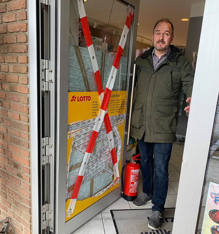 die beschädigte Tür seines Geschäfts offen lässt, damit