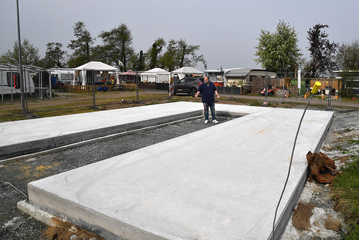 Mehr Komfort beim Campen Bodenplatte für das neue Sanitärgebäude liegt bereits - Verzicht auf die Mittagsruhe Uwe Hochwimmer zeigt die Dimensionen.
