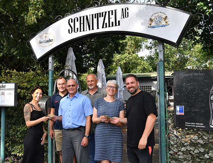 Die Betreiber der Schnitzel AG, Stephanie Wolik (l.) und Stefan Böhs (r.), überreichten jeweils 500 Euro an Thilo Friedrich (3.v.l.) vom Förderverein Kleinschwimmbecken und Marianne Schultheis (2.v.r.) vom Tierheim in Königstädten.