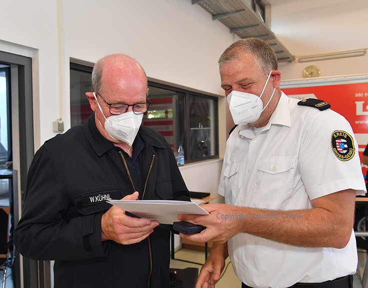 Ehrung für Walter Kühnl (l.): Wolfgang Pauli vom Kreisfeuerwehrverband überreicht dem früheren Nauheimer Feuerwehrchef die Urkunde nach 50 Jahren Dienst bei der Wehr.