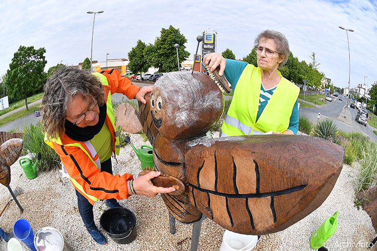 Landfrauen kümmern sich um die Skulpturen auf dem Kreisel, deren Aufstellung sie initiiert haben.