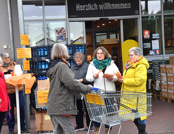 Landfrauen sprechen Kundinnen an, um wegen Gewalt an Frauen und Kindern aufmerksam zu machen.