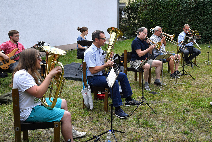 Musikverein probt im Pfarrgarten Das "Lobet den Herrn" gilt als Dankeschön für die Gastgeber von der Kirchengemeinde Reichlich Abstand unter den Musikern? Im Pfarrgarten ist das kein Problem.