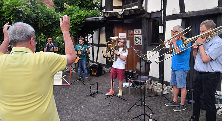 In den Startlöchern Musikverein nimmt am 23. Juni im Freien seine Proben auf - "Jetzt geht es wirklich los" Probe im Garten der Kirchengemeinde.