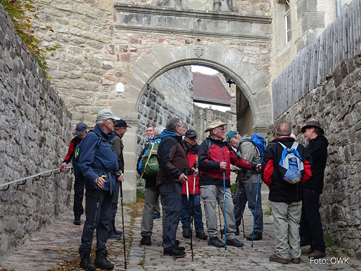 Unterwegs an der Rhön Männer wandern auf mittelalterlichen Spuren Verlassen der Burganlage durch das Haupttor im Renaissancestil.