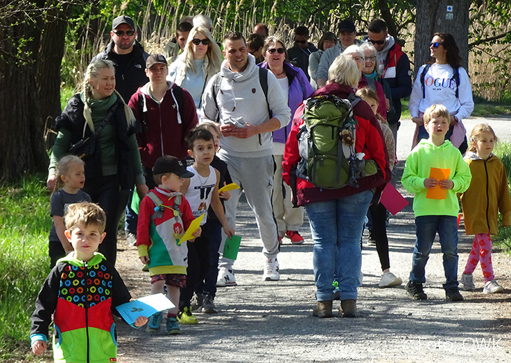 Ostereiersuche mit Familien Kinder finden im Mönchbruch-Gebiet bunte Ostereier am Wegesrand Die Wandergruppe setzt sich in Bewegung.