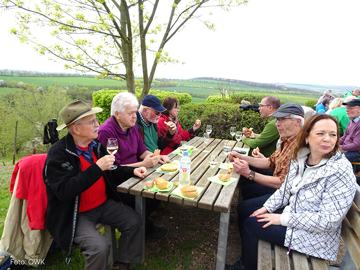 Auf dem Adelberg genossen die OWK-Wanderer bei Weck, Worscht und Woi während ihrer "Hiwweltour" Geselligkeit und Ausblick.