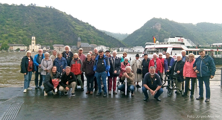 Erinnerungsfoto am Rhein. Vorne in der Hocke ganz rechts Reiner Weber. Der Beitrag ist frei zugänglich.
